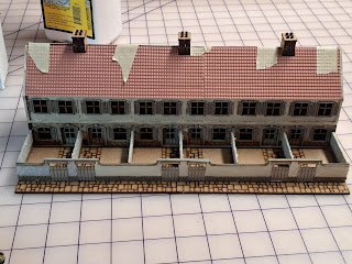 I also started on the large row house that will be house 9 on the Singling map. It has a long way to go. I added the tile roof and painted part of one side.